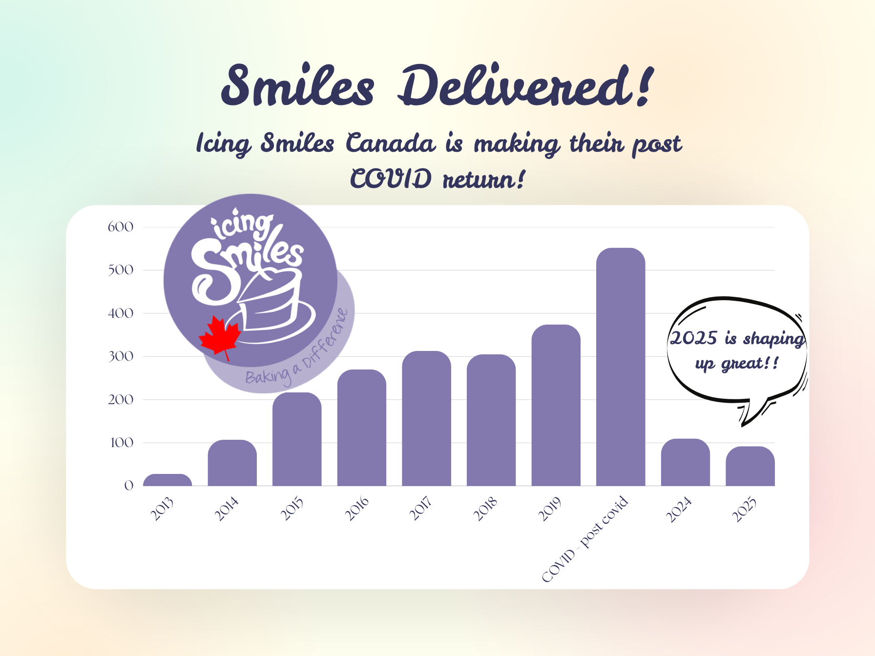 Since delivering our first cake in 2013, Icing Smiles Canada has grown immensely. The year 2016 marked another amazing accomplishment for Icing Smiles Canada. Our 500th cake was delivered and we was on trend to complete more cakes than 2015 and the year was only half done. Every year since has been a growing success. It is truly amazing what our volunteers can accomplish.